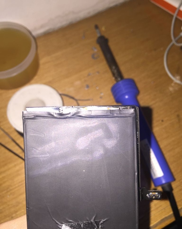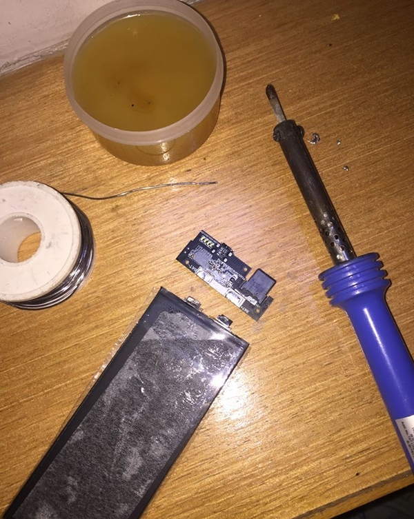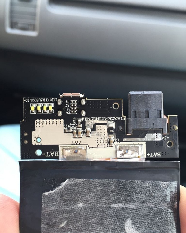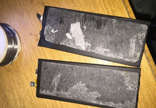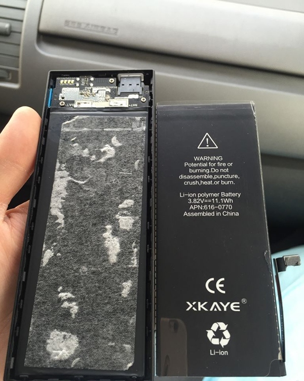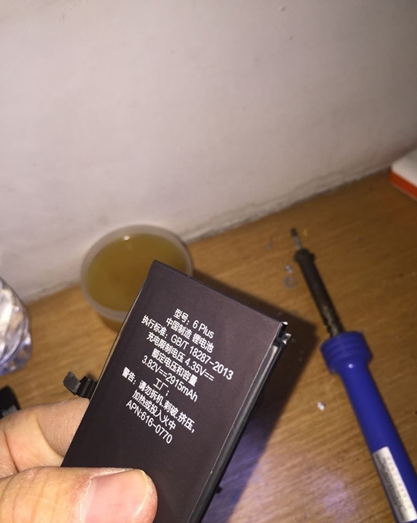 另外,移動電源的另外一塊 iPhone 6 Plus 的原裝電芯做成了備用的電池,並將手機上拆下來的舊電池和山寨電池放到移動電源中。