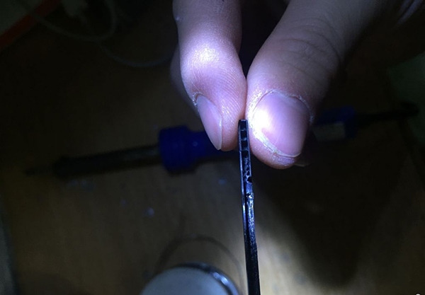 移動電源的電池觸點鐵片偏正中間,而山寨電池則是偏向一邊,所以把鐵片減掉一半左右也沒有影響,能焊上一些就行。