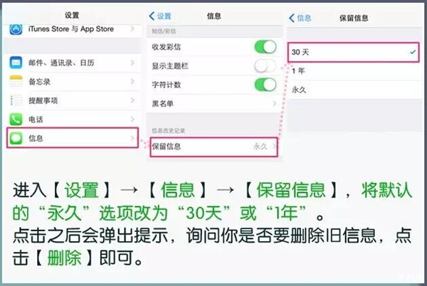 在默認設置下,你的iPhone將永久保存所有發送和接收到的短信,假如你需要查看一年前的短息,這個功能是很實用的,但如果你更想要足夠大的空間,那麼最好選擇關閉它。