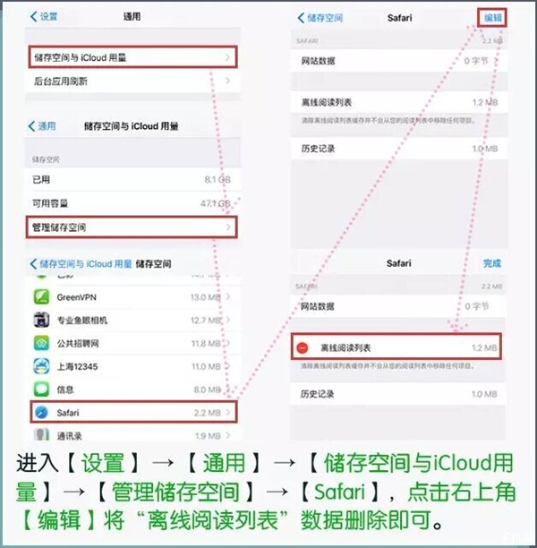 在使用在線應用的時候,無意間也會儲存不少離線內容。例如:Safari浏覽器就會在你在線浏覽的時候自動保存一些內容供你離線時使用。
