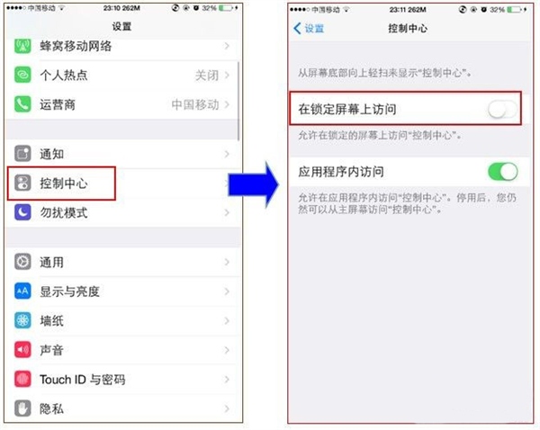 1、停止鎖屏狀態下對控制中心的訪問,防止鎖屏狀態下蟊賊通過控制中心設置手機的飛行模式和靜音模式