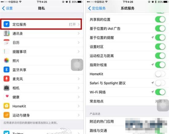 在iOS9系統中,蘋果加入了諸如附近的熱門應用程序、常去地點等生活實用工具,其實無形之中讓iPhone不停地進行位置定位。我們為了iPhone的電池續航,最好把所有這些不需要的系統服務全部關閉,能減少電量的損耗,還能減少不必要的隱私洩露。