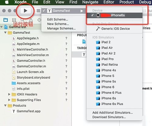 4. 把 iPhone 連接到 Mac,並選擇你要安裝的 iPhone,然後點擊左邊的運行圖標。