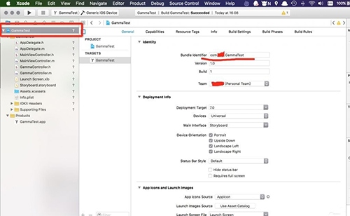 6. 登錄開發者帳號之後,再次點擊運行按鈕,然後繼續報錯,提示你“An App ID with Identifier…is not available. Please enter a different string.”,這時候,我們需要前往到如下圖所示的地方修改“Bundle Identifier”,修改成"com.xxx.GammaTest"(xxx 可替換成任何你想要的名字)。