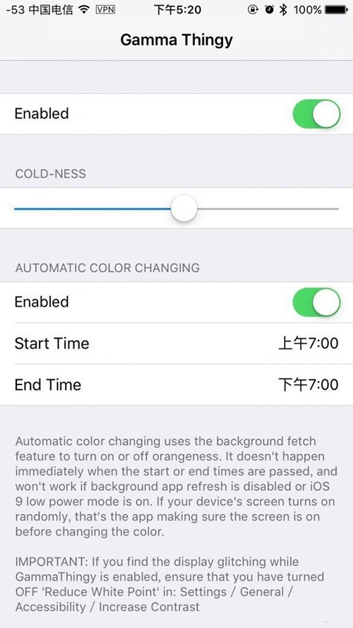 9. 進入 GammaThingy App 之後打開開關,拖動滑條就能調整色溫了,此外,我們還可以根據自己的需求,設置調整色溫效果在什麼時刻生效。