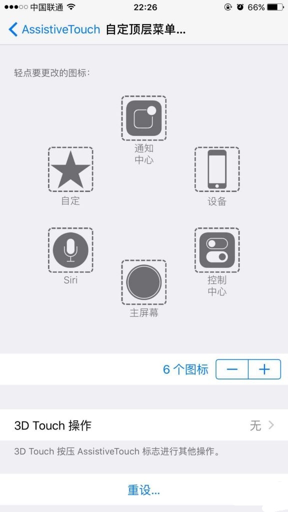 2. 點擊自定頂層菜單,然後我們就會看到 6 個圖標圍成一圈,下方除了顯示圖標數量之外,還有“-”和“ ”兩個按鈕。