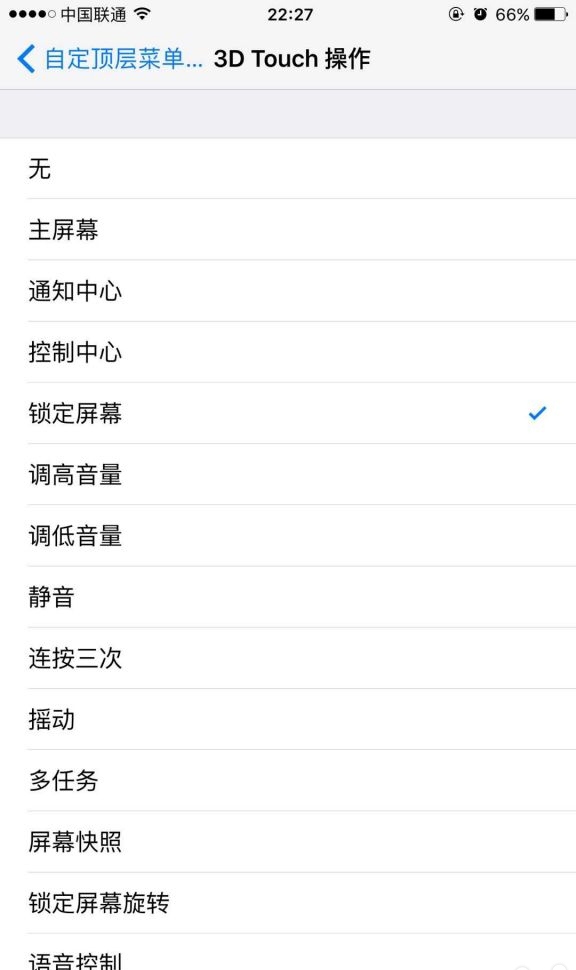 4. 點擊 3D Touch 操作,選擇“鎖定屏幕”,完成之後,我們只需要重按 AssistiveTouch 小白點,就能實現鎖定屏幕的效果。當然,可以根據自己的需要選擇其余的選項,比如屏幕快照、語音控制以及音量調整等等。