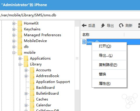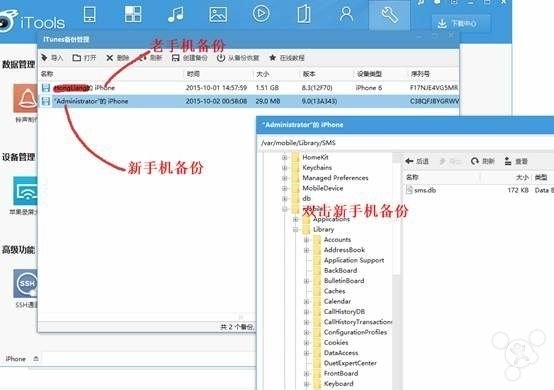 4.在iTools中打開(雙擊即可)新款iPhone的備份文件,進入目錄/var/mobile/Library/SMS/,然後將sms.db替換為第二步中導到電腦中的文件。