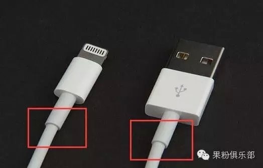 這裡重點要說的是這個金屬網。iPhone數據線的內部金屬網會一直延伸到數據線接頭的保護橡膠圈的位置。就是下圖所標注的這兩個位置: