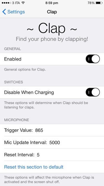 “Clap” 顧名思義就是和拍手有關,安裝之後你的iPhone就會偵測響亮的聲音,例如拍手。一旦偵測到,就會響起。然後你就可以聽著響鬧聲發出的位置,找回iPhone.