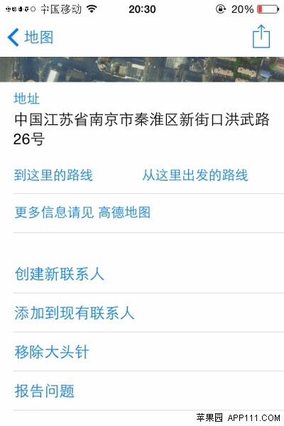 第二步,點擊該標記,即可進行查看該處的詳細地址、路線規劃及看街景地圖,還可以創建新聯系人等。