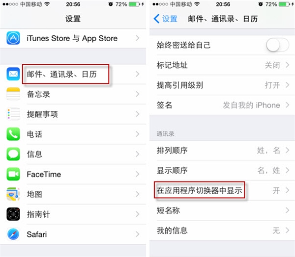 步驟1:在“設置”界面下進入“郵件、通訊錄、日歷”操作界面;然後拖動屏幕到下方找到“在應用程序切換中顯示”一項並單擊。