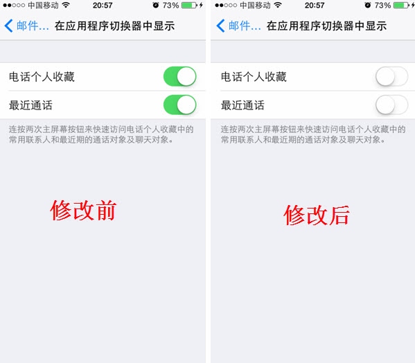 步驟2:“電話個人收藏”和“最近通話”兩項默認情況是開啟狀態,這樣就會在應用程序切換界面中顯示最近聯系人的信息,只要把這兩項都關閉就不會再出現了。