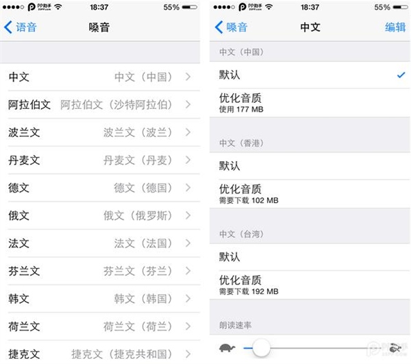 各國語音選擇,進入【噪音】,我們就將看到各種語言供我們選擇,每種語言還包括了這個國家的特色。比如下面的中文界面,我們就可以發現中文、香港、台灣幾種地方話供我們選擇。這意味iPhone還能給我們念出粵語來。是不是非常全面了。每種語言大約是170到200M左右。其中英文(美國)的Alex版聲音包容量最大,高達869M,但效果是非常贊的。不過這個功能還沒有高級到直接將漢語翻譯成英文來念出來。你只有進入含英文內容的界面才能聽到英文朗讀。