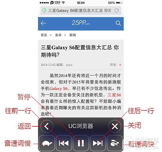 3、進入需要朗讀文字的頁面,用二個手指從屏幕頂部向下滑動,即可打開屏幕朗讀功能。此時系統會朗讀屏幕上可以朗讀的內容,並且還會在控制條顯示。