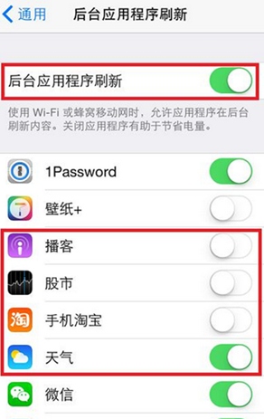 3、後台自動更新App:iOS有自動更新功能,會在後台自動為已安裝的App更新資料,既耗電又耗系統運存,建議在“設置-通用-後台應用程序刷新”中關閉不需要更新的App.