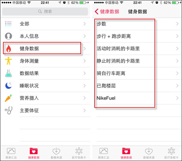這個數據從何而來的呢?其實,在不借助任何其它第三方配件的情況下,iPhone5S設備即可利用自身的傳感器來自動監測用戶的一些數據,如計步、行走距離等。點擊界面下方的“健康數據”項,再點“健身數據”分類,即可看到其中可以記錄的項目。