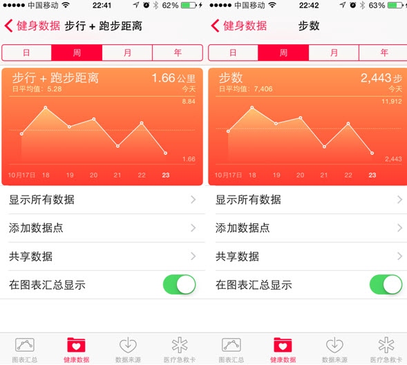 iOS8自帶的“健康”應用,在iOS8.1中已換成中文“健康”字樣,點擊圖標進入的默認界面是“圖表匯總”。在這裡大家會發現該應用已經默默的為我們記錄了每天的步行和跑步距離的數據。