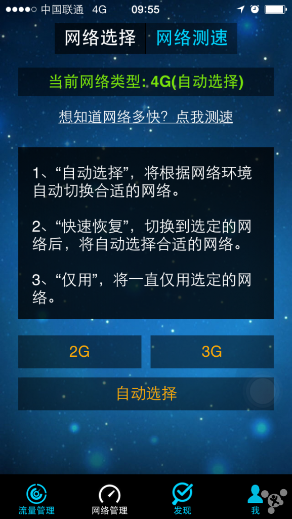 第三步:運行移動流量儀,網絡管理裡選擇自動選擇,如下圖。