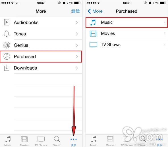 第六步:選擇「已購買」選項,然後選擇「音樂」類別。