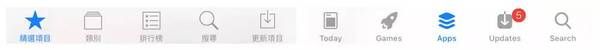 一、iOS 11 App Store 資訊架構1. 全新的標簽頁在 iOS 10 以前, 標簽頁的五個項目分別是「精選項目、類別、排行榜、搜索和更新項目」, iOS 11 App Store 則變成了「Today、Games、Apps、Updates 和 Search」。