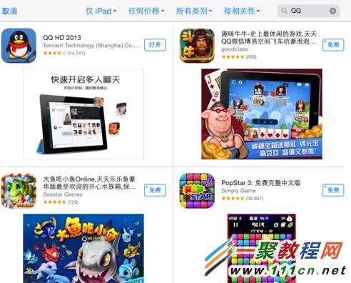 2、現在我們進入appstore中搜索QQ,會發現如下圖有僅IPAD與僅iphone 了,我們要登錄兩個QQ號就不要管那麼分別都安裝