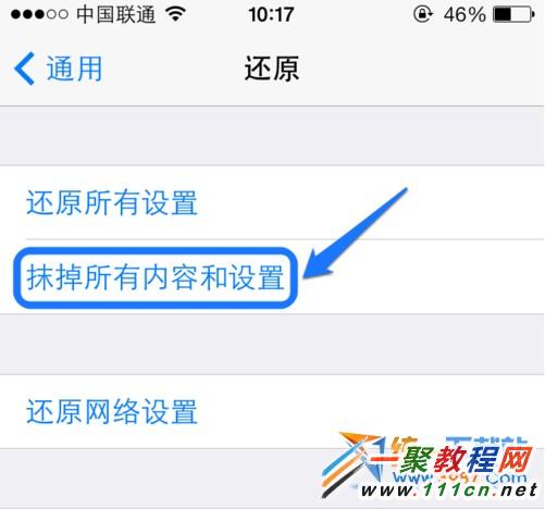 3.之後在通用中找到“還原”選項 4.由於這裡是想要把手機恢復到出廠設置,始整個手機系統的初始化狀態,所以在這裡選擇“抹掉所有內容和設置”選項,如圖所示