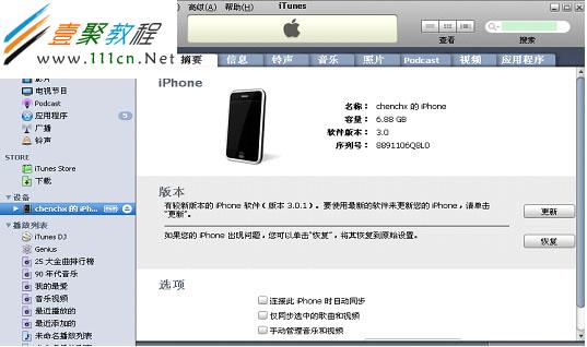 3.在iTunes中,從左欄中選中iPhone後在“摘要”、“信息”、“鈴聲”、“音樂”、“照片”、“視頻”和“應用程序”設置面板中根據需要配置同步設置注:關閉iPhone的自動同步的方法:將iPhone連接到電腦,在iTunes中,從邊欄中選擇iPhone並點按“摘要”標簽,取消選擇“連接此iPhone時自動同步”