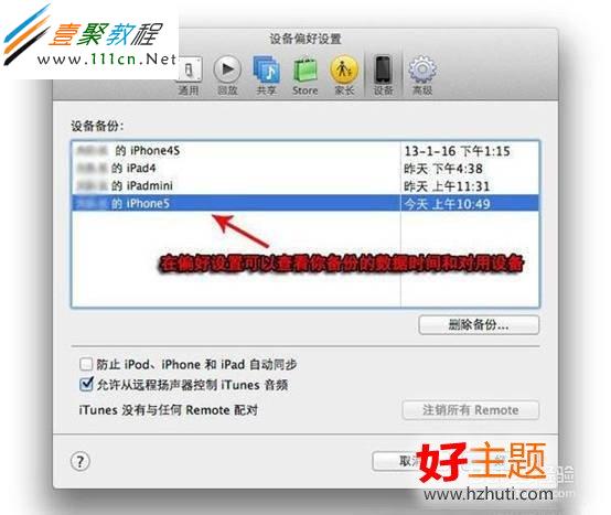 3:備份完的文件大家可以在iTunes的偏好設置-設備中查看,這裡會顯示你備份的設備及備份的時間。