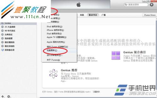 1)首先,打開itunes,點擊幫助選項卡,選擇下拉菜單中的檢查更新。(如下圖所示)