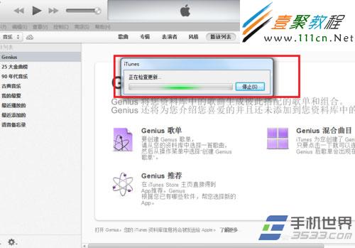 2)itunes開始檢查更新,檢查會有點緩慢,請不要著急點停止。(如下圖所示)