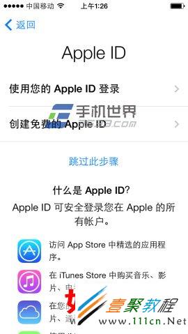 2)然後如果有apple id我們就跳過此步,如果沒有appleid我們“創建免費的Apple ID”。輸入自己的個人信息