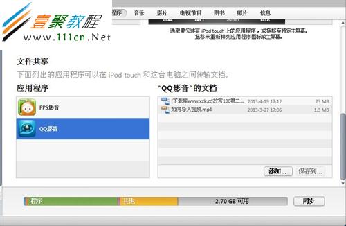 具體方法:連接到電腦,打開iTunes,點擊設備,選擇應用程序標簽,下方有個“文件共享”,找到QQ影音,把電影拖入到左側的列表中即可