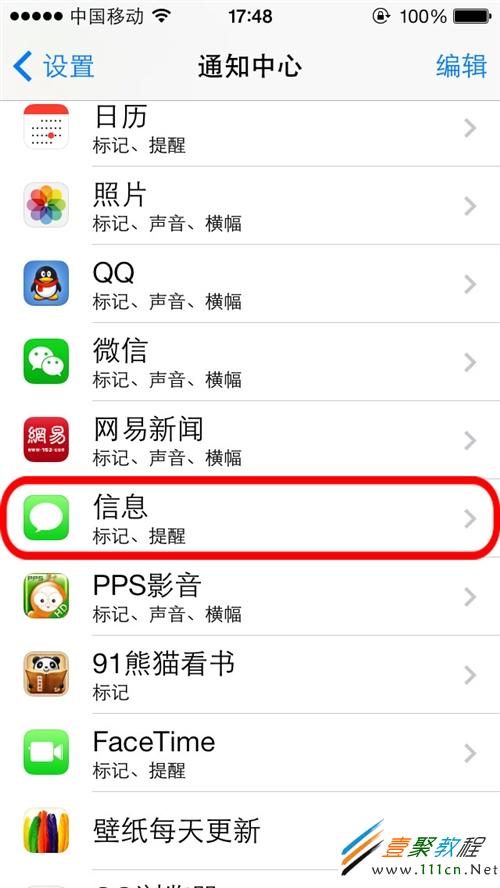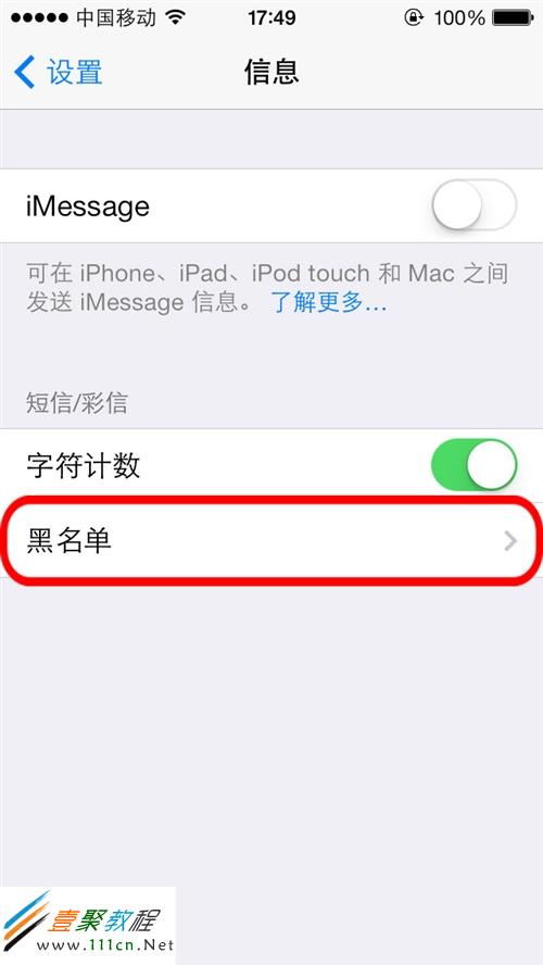 第5步:在iOS7系統新增加了一個黑名單的屏蔽功能,點擊設置,選擇信息,點擊黑名單 如下圖所示