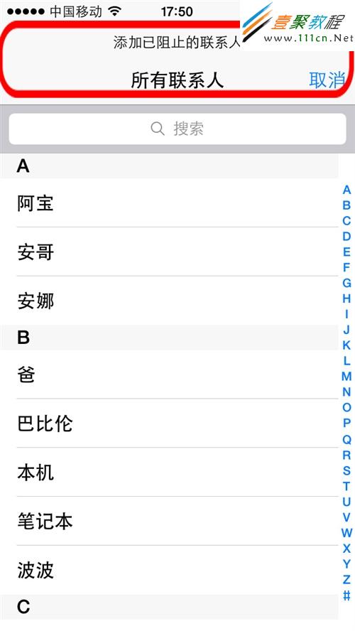 第6步:選擇新增,然後系統會自動彈出你的所有聯系人,選擇你要屏蔽的聯系人,你將不會收到黑名單中聯系人的來電,信息或者FaceTime呼叫,但這個功能僅僅針對的你手機中已經添加的聯系人,陌生號碼如果要添加到黑名單,要先將電話號碼儲到聯系人才能添加。