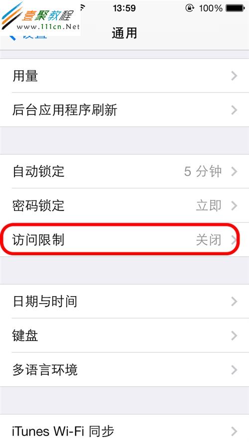 第3步:然後在通用中點擊“訪問限制”,現在我們直接打開"訪問限制",如果我們己經打開訪問限制,可直接輸入密碼後請跳到第7步;