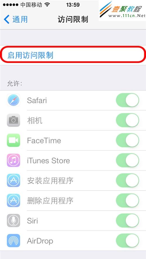 第4步:如果沒有打開訪問限制,我們現在打開“訪問限制”,此時我們會看到主列表中有許多應用程序是灰色的不可用狀態,要想修改,首先點擊上方的“啟用訪問限制”按鈕;