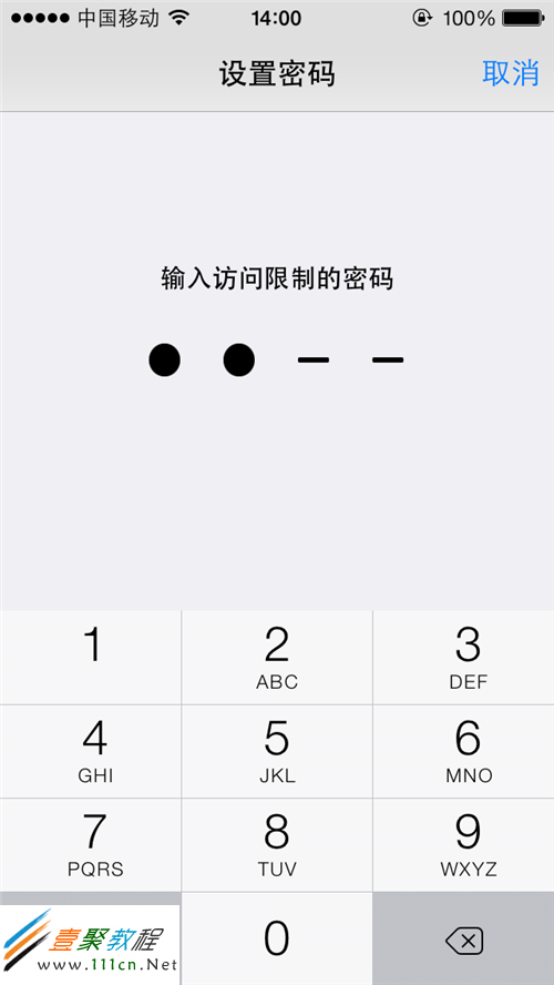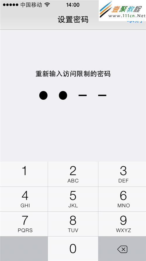 第5步:由於“訪問限制”權限很大,將影響到很多重要的設置,所以為了安全起見蘋果強制要為其設置四位數字密碼。按小鍵盤可輸入密碼,為防止旁邊有人偷窺,密碼在手機上將統一以點顯示;