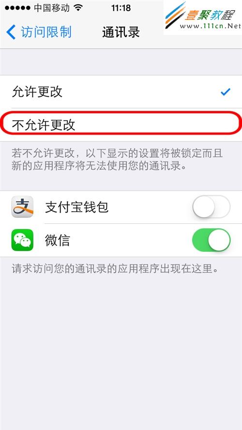 第8步:通訊錄設置中默認為“允許更改”,即有應用程序要訪問通訊錄時,是可以進行提示並允許的。在下方的列表中我們看到已經有一些應用程序已經取得了訪問通訊的權限,在本例中有支付寶錢包和微信,被禁止訪問的是支付寶錢包。此時你可以單獨對應用程序關閉開關禁止訪問。如果想鎖定當前的設置,並且不允許新增應用程序訪問,還需要點擊“不允許更改”。此時,列表將會被鎖定不能修改;