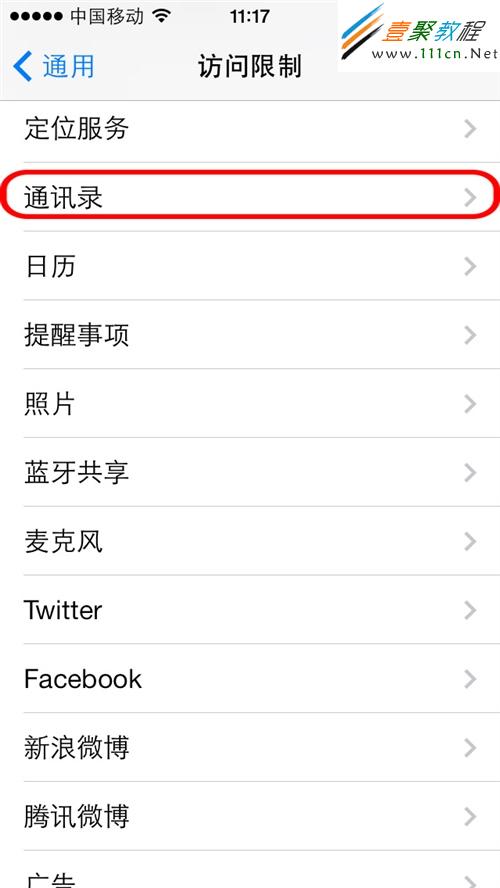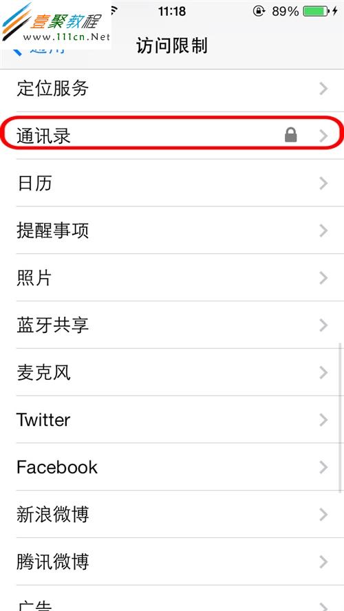 第7步:設置密碼成功後,“訪問限制”將可以使用,此時主列表中找到隱私項目中的“通訊錄”,點擊;
