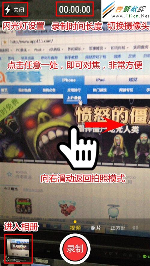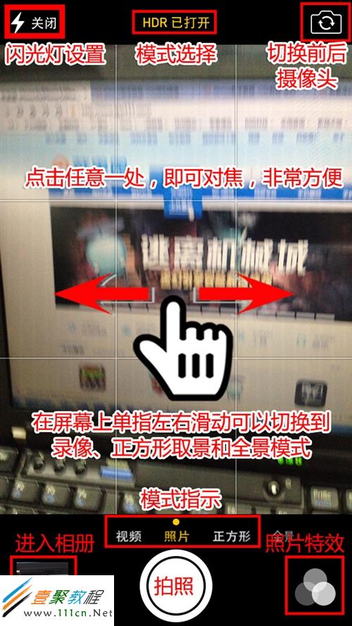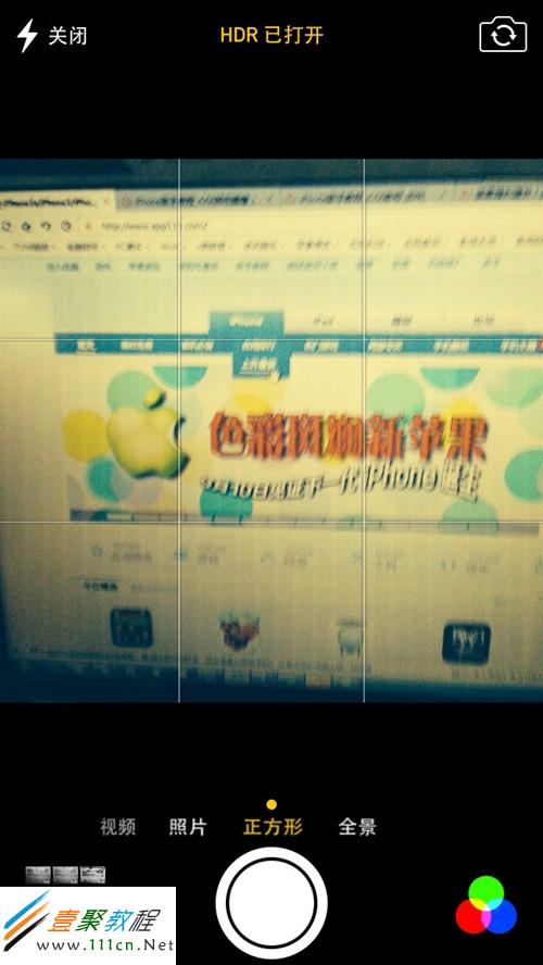 與iOS6和iOS5不同的地方主要是可以滑動切換視頻、正方形取景和全景拍攝模式,右下角的實時特效也是新功能,不過iPhone4是不支持的哦。