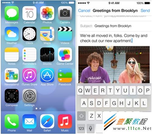 iOS 7的App圖標采用了新的坐標體系和配色方案,去掉了之前“大光圈”的遮罩,盡管有的圖標依然覆蓋了漸變的光澤,但色彩的搭配和幾何圖形的設計讓系統整體顯得很清爽,符合Ive將極簡的硬件設計和軟件系統結合的理念,讓iOS系統與iOS設備渾然一體。