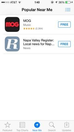 這是蘋果iPhone5s的App Store中新增的一個功能,旨在為用戶提供更多基於位置的應用服務。比如,我現在實際上是在美國加利福尼亞州的Napa旅行,只要打開App Store選擇“Near me”選項,就可以看到與當地有關的App,非常適合旅行時使用,十分方便。只不過,在國外旅行時,中國的Apple ID無法搜索到任何附件的應用內容,還需要更換為當地的Apple ID才行。