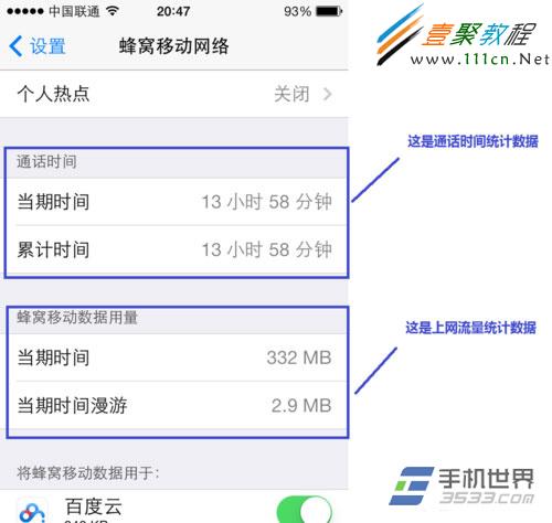 2)在“蜂窩移動網絡”設置裡,可以打開蜂窩移動數據通過手機卡上網,還可以在這裡打開3G網絡,接下來是手機通話時間統計和流量統計數據