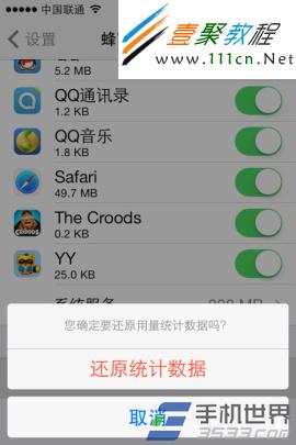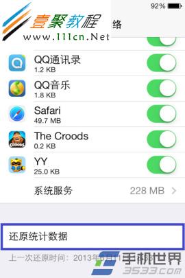 4)然後就可以看到系統服務所使用的網絡流量明細列表了,若要還原統計數據,請點擊“蜂窩移動網絡”設置列表最底部的“還原統計數據”選項,最後再點擊“還原統計數據”即可。(如下圖所示)