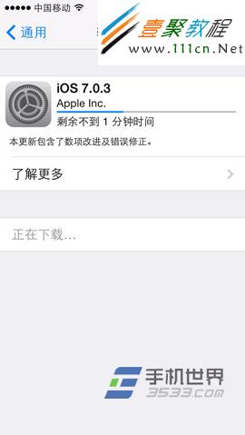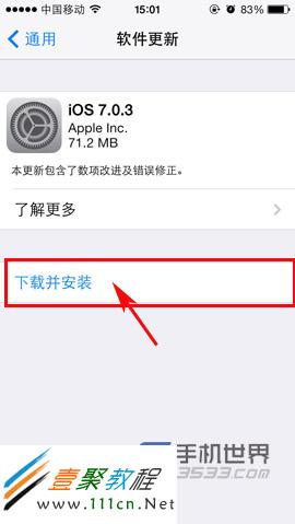 3)等檢查更新完畢,如果有更新的系統就會有提示,如我的是提示有IOS 7.0.3更新包 ,我們現在只要點擊“下載並安裝”後等待就行了 系統下載好後會自動安裝。