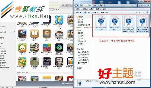 4、下載完ipa文件,用USB線連接ipad和電腦。啟動itunes,點擊“資料庫-應用程序”,然後把下載好的ipa文件拖進。