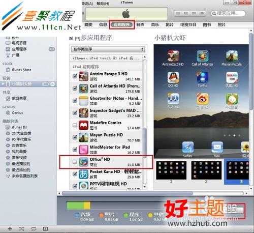 5、在左側菜單,點擊你的ipad名字,選中你的機器,然後進入“應用程序”,點擊右下角的“同步”。同步完成後,程序就在你的列表中了。