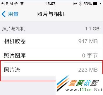 4.就可以看到照片流占用的空間,比如我不太愛照相,照片流中僅使用了223MB的空間