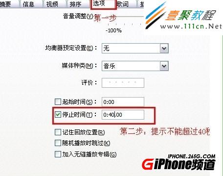 4.選擇“選項”填上“起始時間”和“停止時間”(在40秒以內),-“確定”